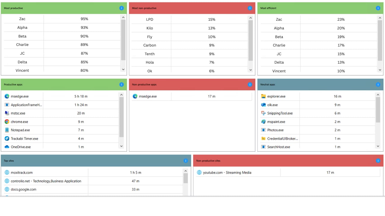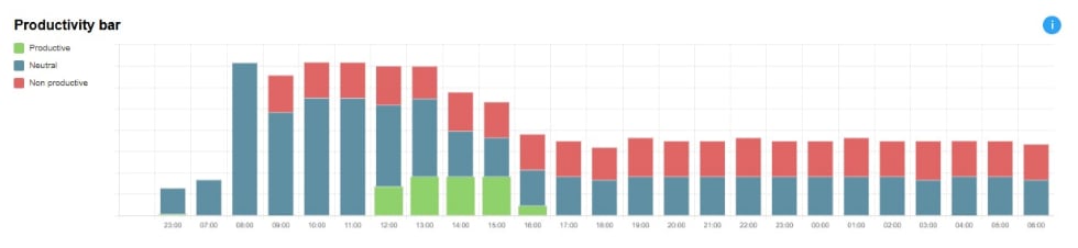 Productivity bar - Visually displays Productive, Non-productive, and Neutral zones on a clear, color-coded graph for quick and easy viewing and interpretation. It provides an at-a-glance representation of how time or tasks are distributed across productive, non-productive, and neutral activities, enabling fast assessment of overall efficiency and helping users identify areas for improvement.