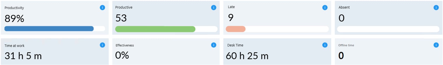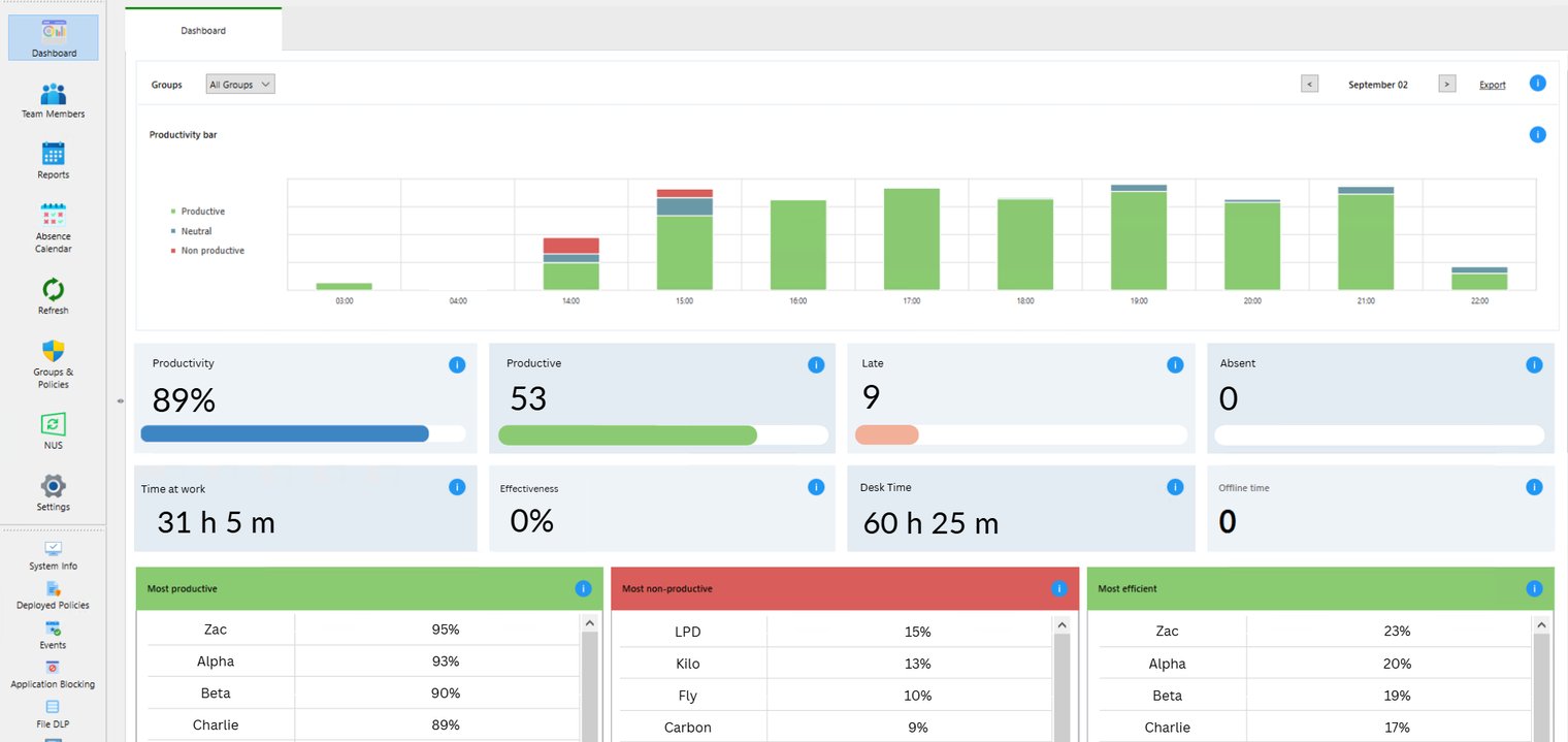 The dashboard displays the current status of your group for the day, offering a concise summary of the most critical team metrics. It highlights employee activity and productivity so you can quickly understand performance, spot trends, and act on issues.