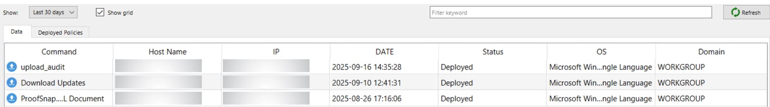 Deployed Policies displays a detailed deployment log for each user, showing which policies were applied, when they were deployed, and any relevant status or outcome information for tracking and auditing.