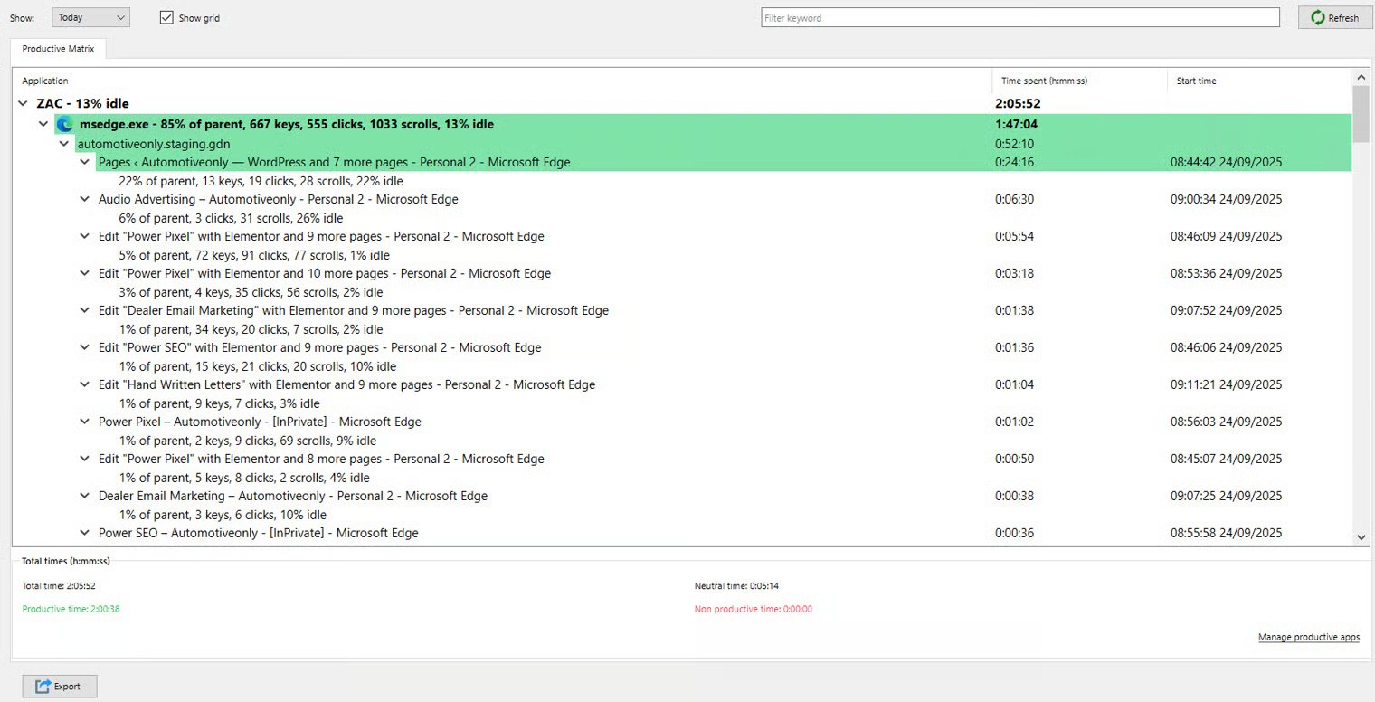 Productivity Matrix — A visual tool that categorizes activities by productivity and engagement, mapping applications, websites, and tasks into zones (productive, neutral, non-productive) to reveal time allocation, identify efficiency gaps, and guide prioritization and workflow improvements.