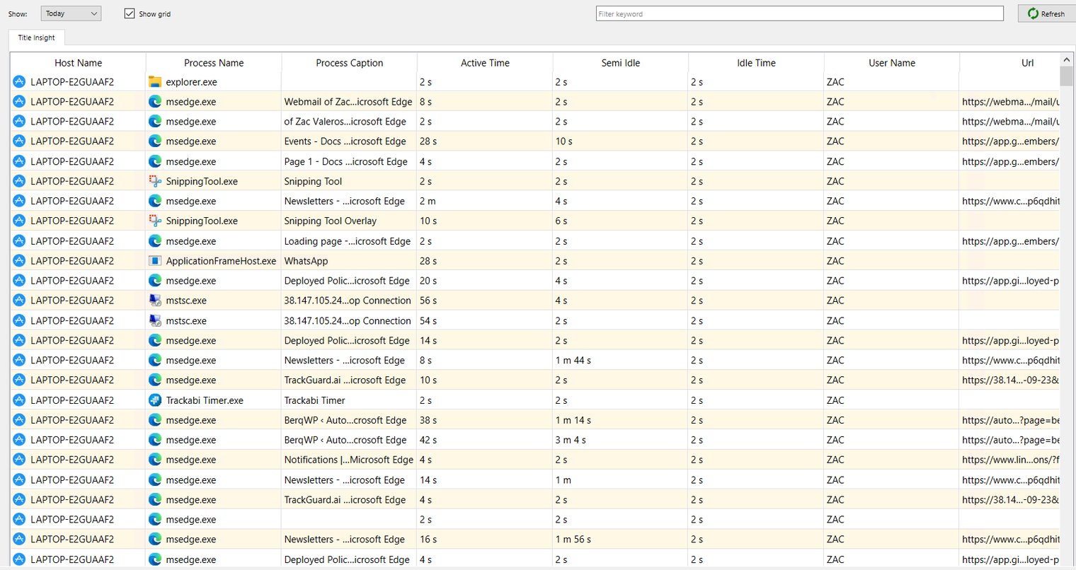 Title Insight reports window used to track which apps and windows users interacted with, how long they were active or idle, and the associated user and web context for analysis and auditing.