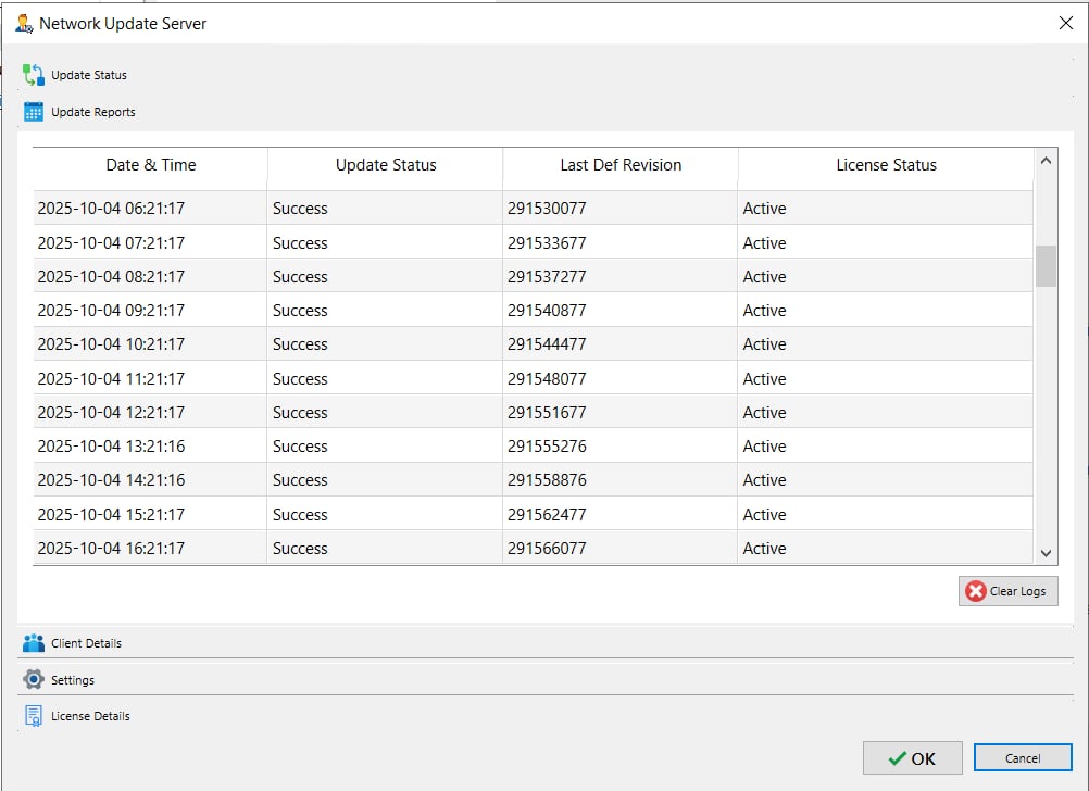 Update Reports show Date & Time, Update Status, Last Revision, and License Status.