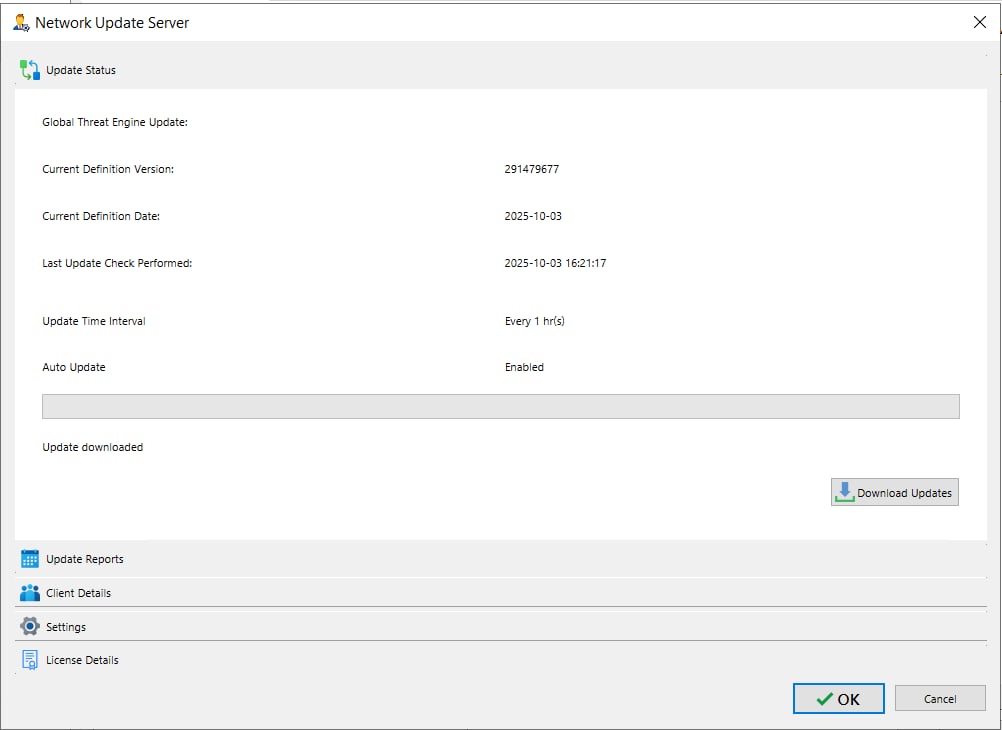 Update Status displays each Agent client's current update information — definition version and date, last update check, update interval, and auto-update status. Admins can manually trigger updates with the "Download Updates" button.