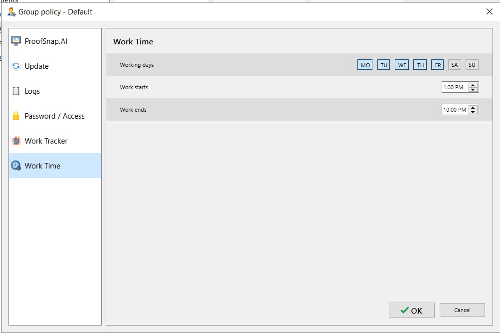 Work Time configures the workday and defines start and end times, allowing admins to set official working hours and recurring schedules (daily or weekly). These settings standardize time tracking, attendance calculations, and reporting across the organization.