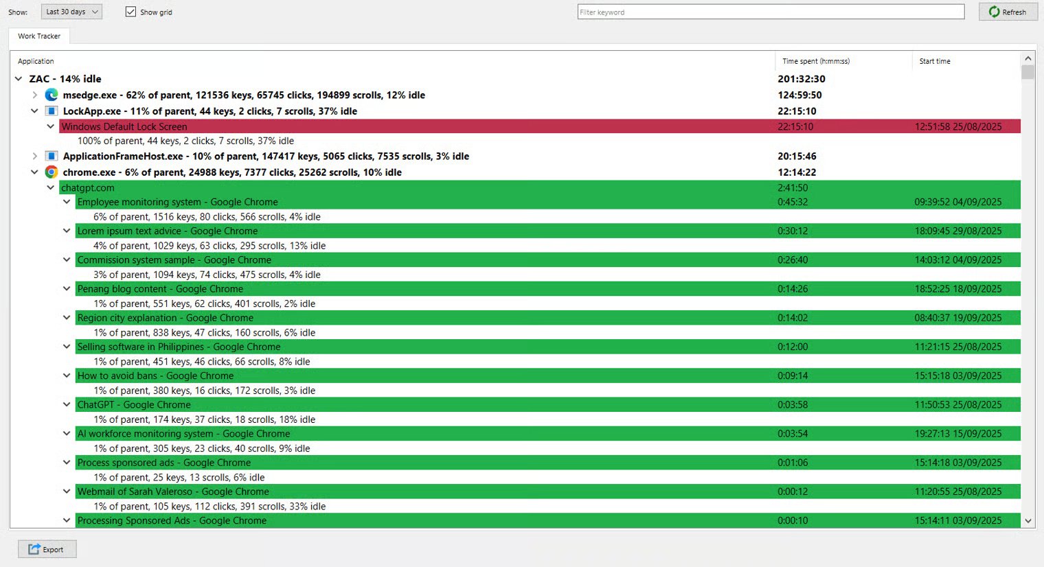 Work Tracker provides a detailed record of application usage by logging the application name, total time spent, and start time for each session. It also captures activity metrics—number of keystrokes, mouse clicks, scroll actions—and idle durations to give a fuller picture of user engagement and productivity. These combined data points help identify active working periods, interaction intensity within each app, and gaps of inactivity for performance analysis and workload optimization.