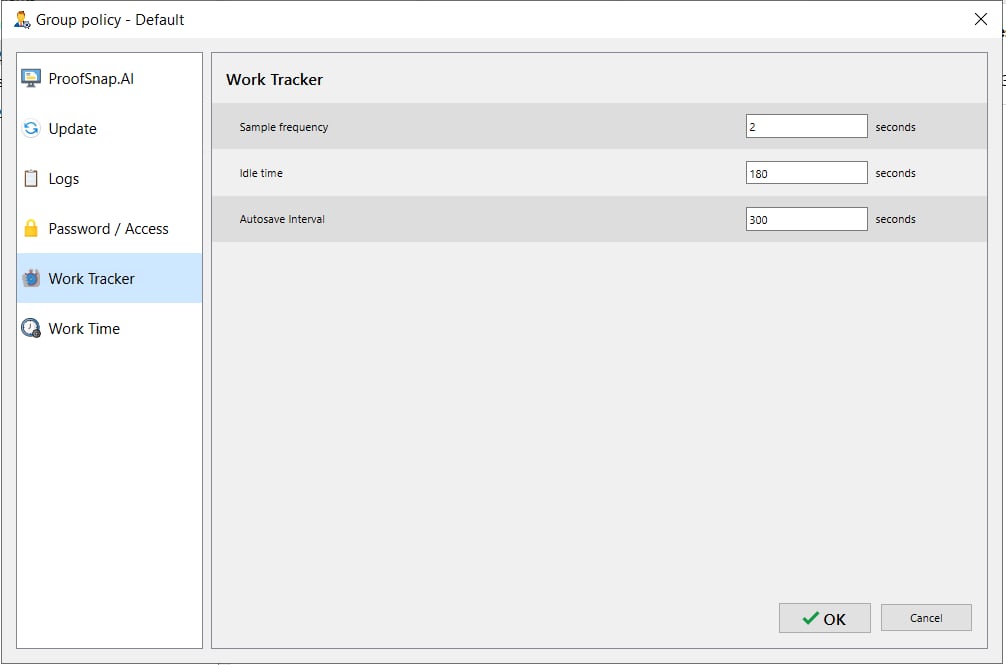 Work Tracker is designed to configure sampling and capture settings: sample frequency, idle time threshold, and autosave interval.