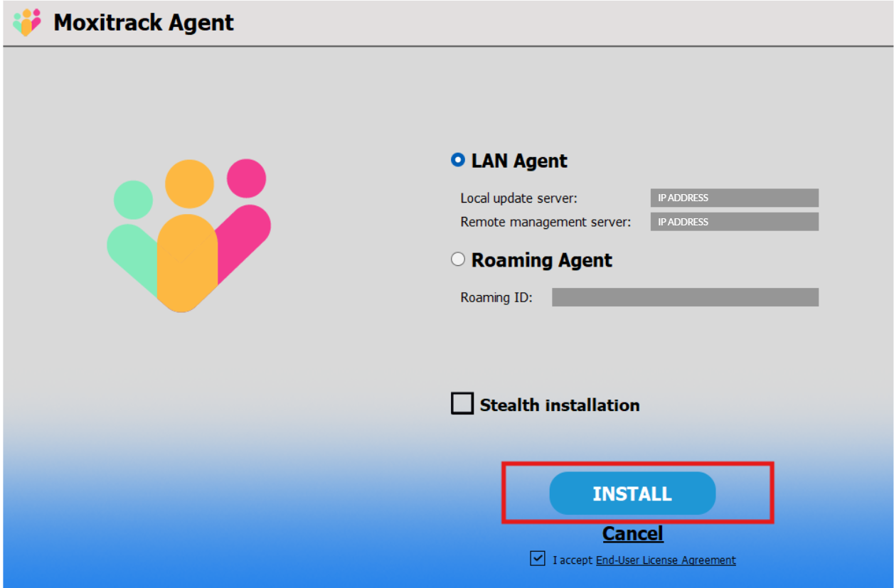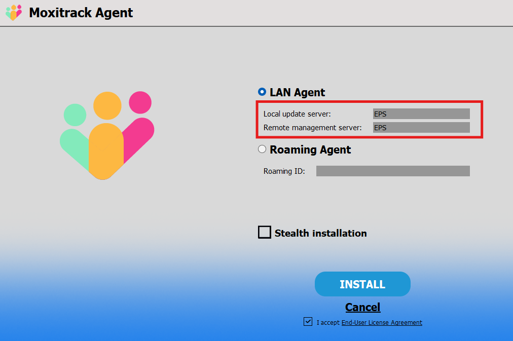 Once you click install, add the Server address that was given to both fields for Local Update Server and Remote Management Server.